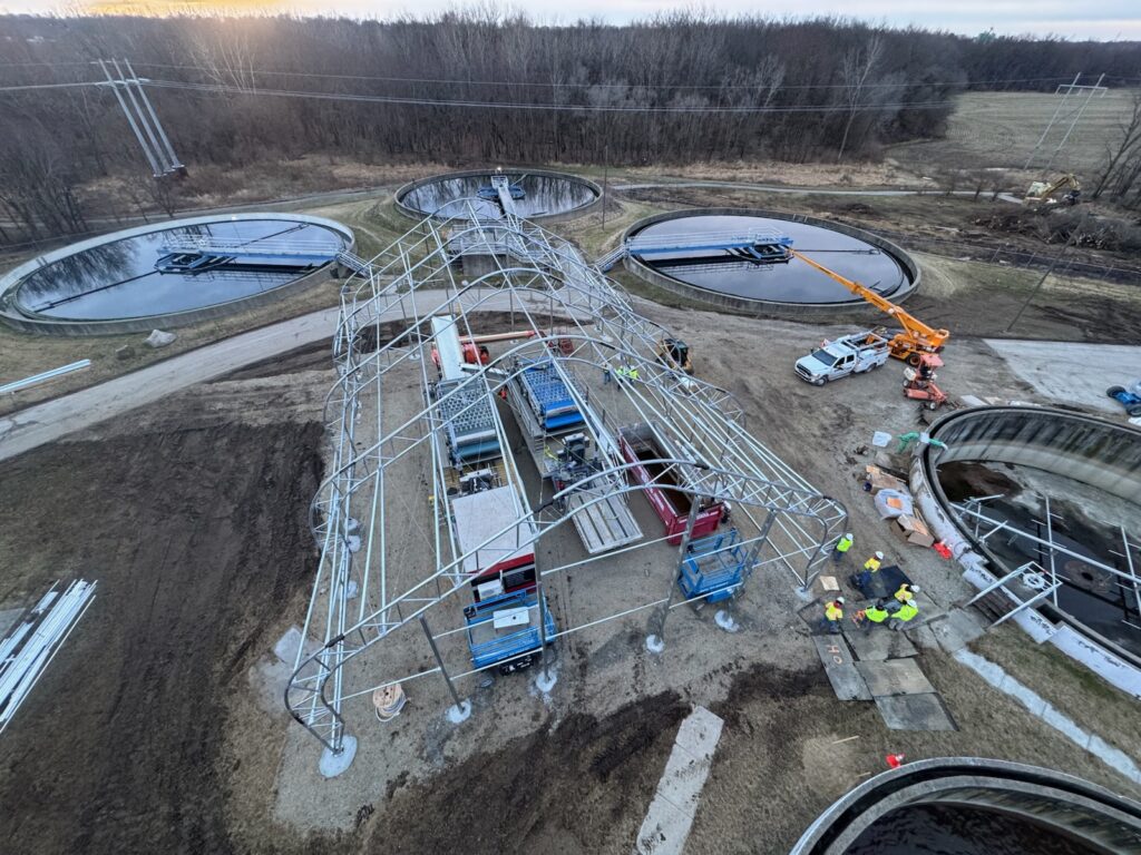A drone’s eye view of an active job site in West Lafayette, showing crews installing equipment and structural framework.